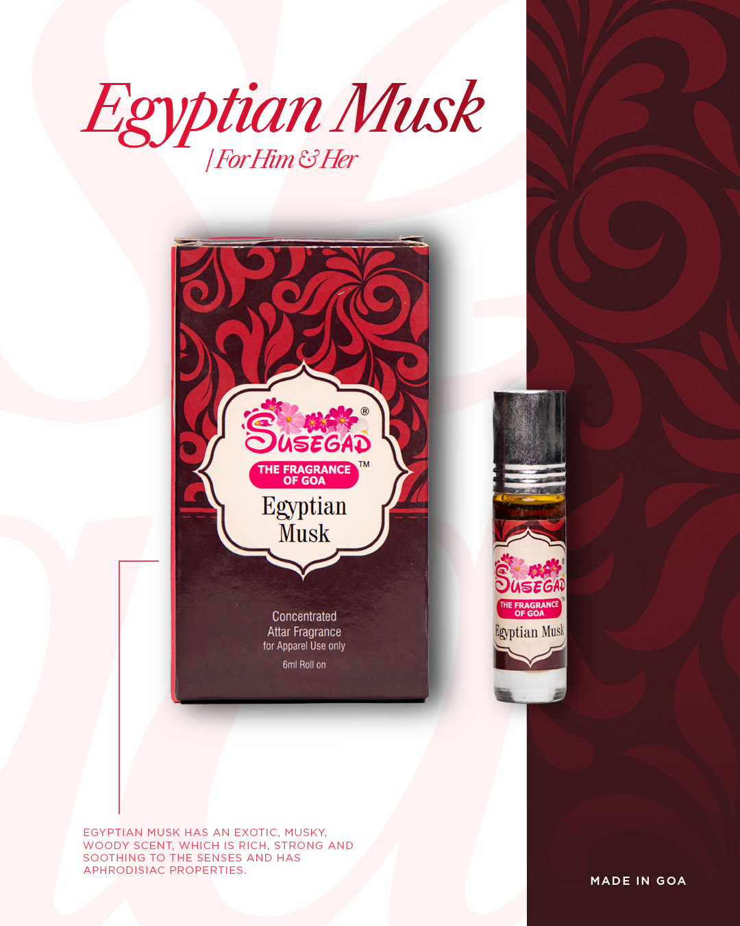 Egyptian Musk has an exotic, musky, woody scent, which is rich, strong and soothing to the senses and has aphrodisiac properties.